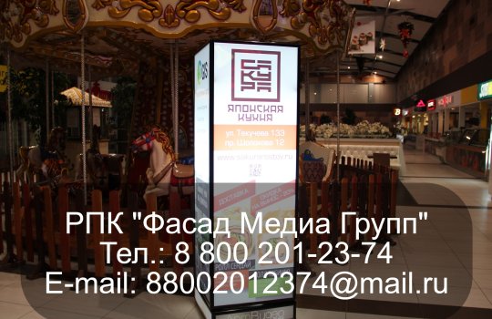 РПК «Фасад Медиа Групп» напечатала плакат и разместила рекламу на пилларсах, установленных в торговых центрах. Размещение рекламы позволяет значительно повысить узнаваемость бренда, а также сообщить потенциальным клиентам и покупателям информацию о товаре или услуге