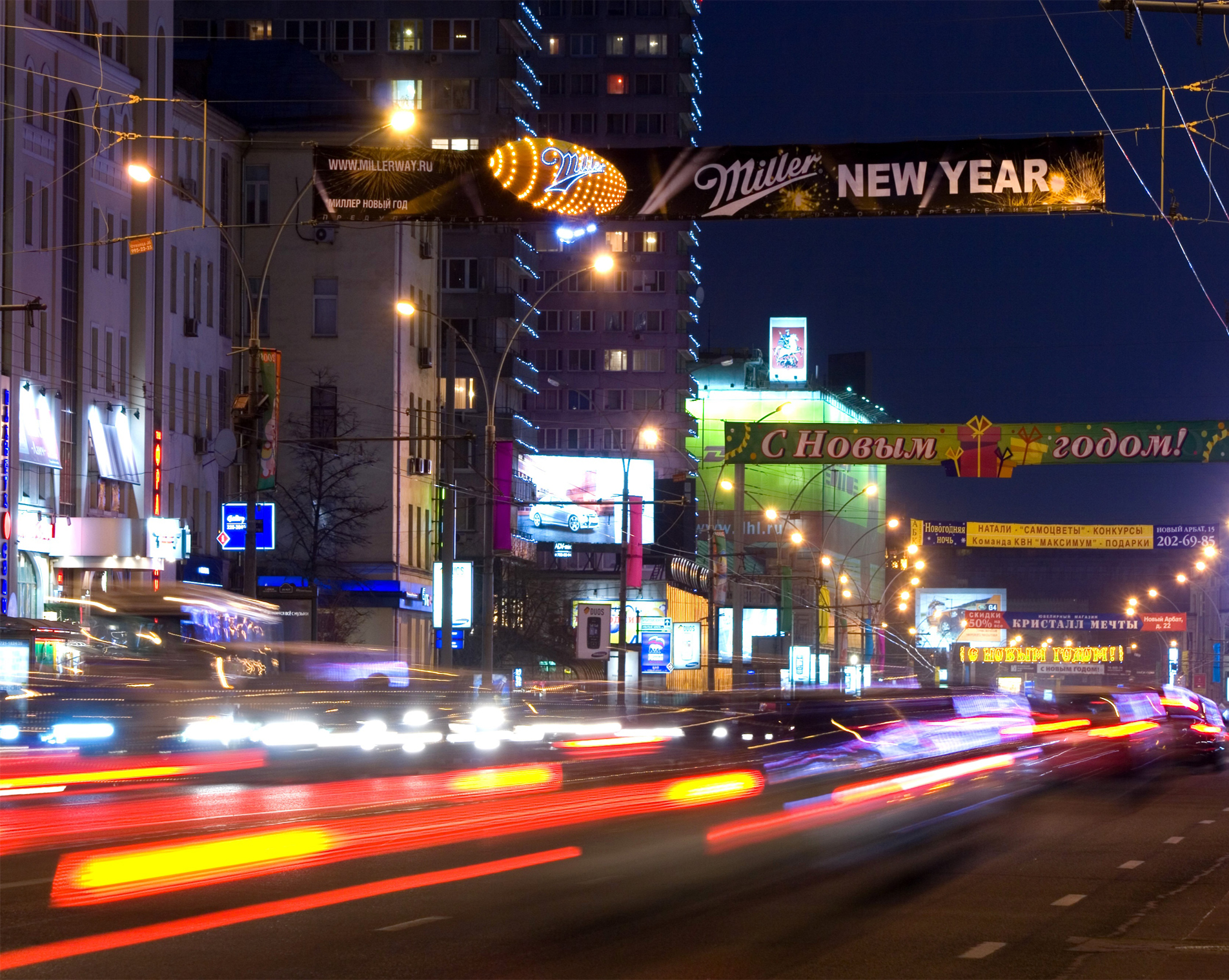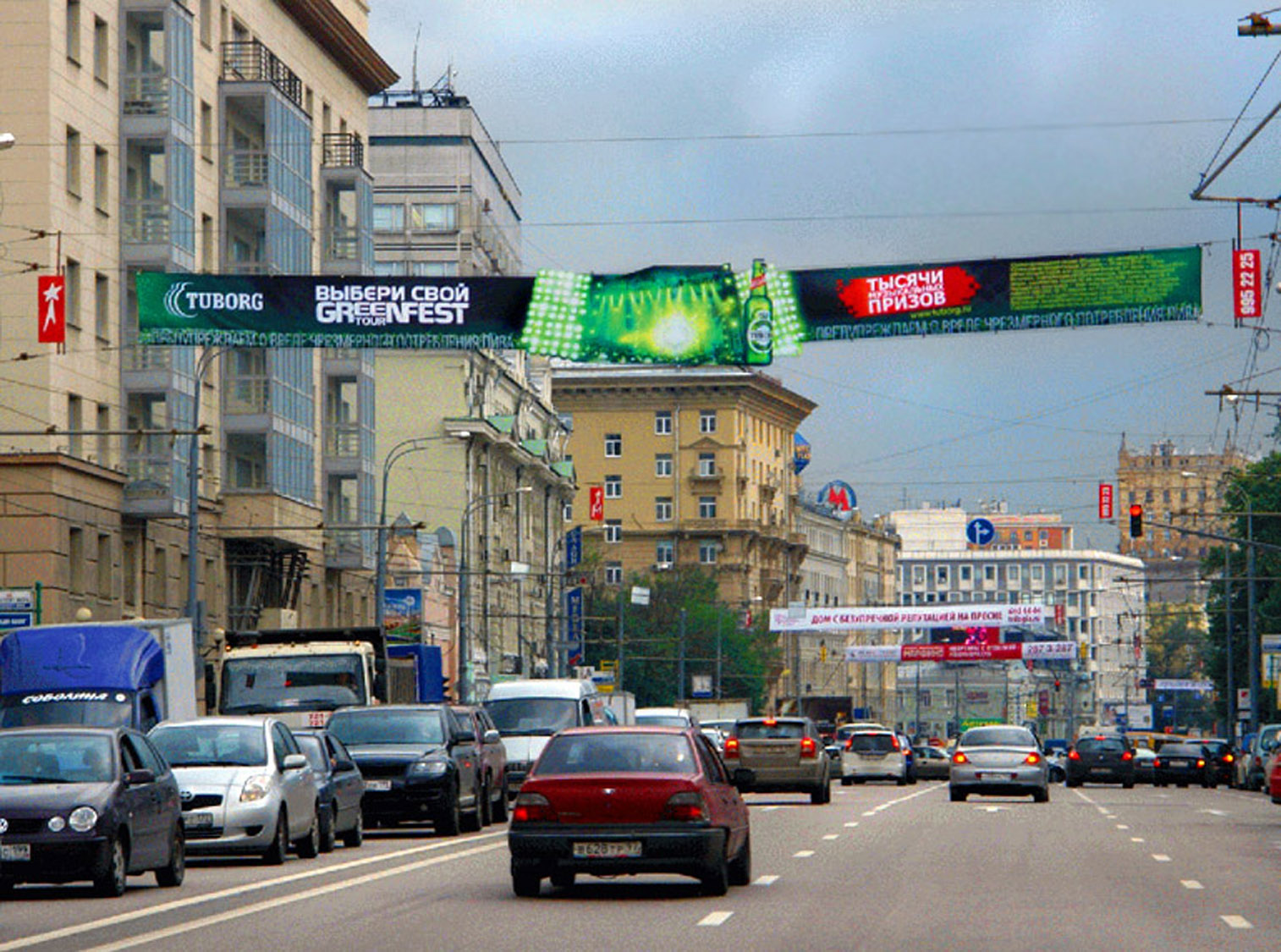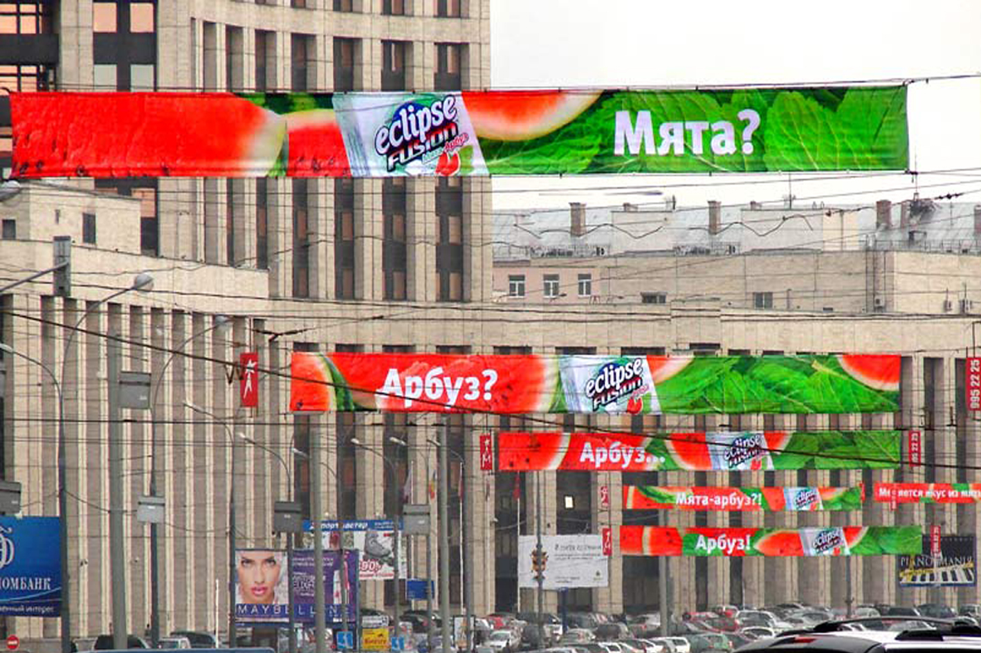 Примеры рекламы на перетяжках представлены на фото: