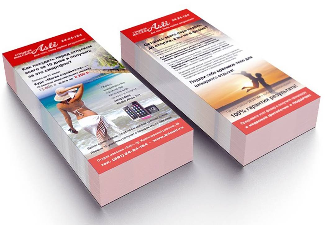 Цветопроба – это несколько экземпляров (минимакет) вашей будущей рекламы, из которых вы выбираете тот, который по цвету больше вас устраивает. Цветопроба печатается нами и доставляется нашим курьером по указанному вами адресу. Оплата за цветопробу не взимается. Если вы заказали цветопробу, то она является «действительной» при условии возврата 1 экземпляра цветопробы с вашей подписью. Претензии по оттенкам цвета принимаются только согласно подписанной цветопробы. Цветопробу мы делаем за 2 недели до основного заказа.