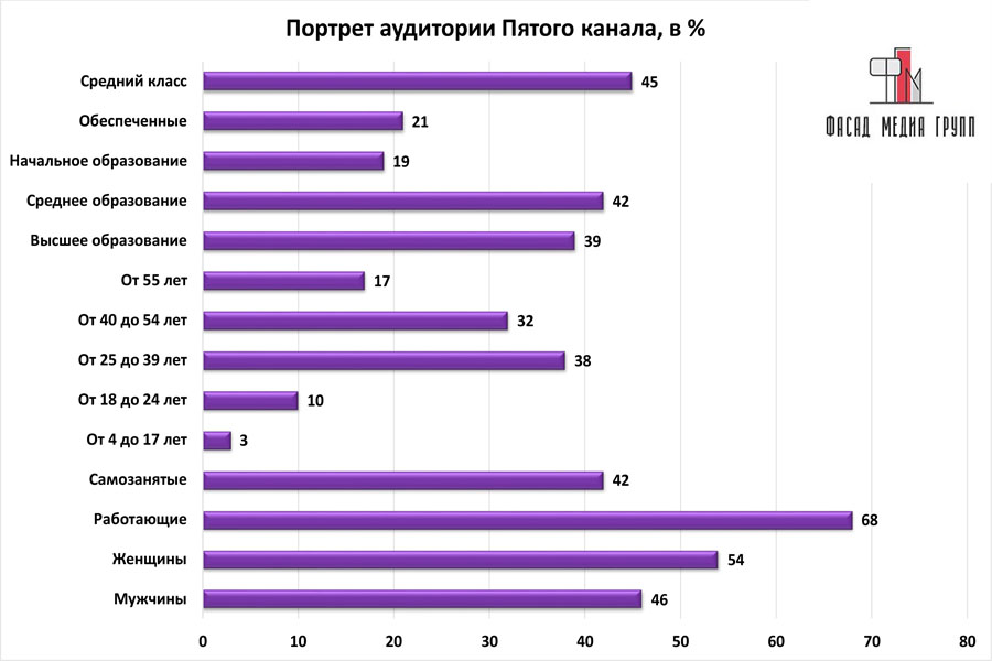 Благодаря качественному, сбалансированному контенту аудитория «Пятого канала» многочисленна и разнообразна.