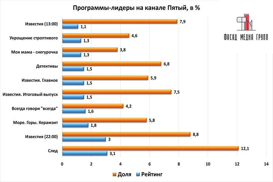 Вышли новые серии легендарного «Следа». Указанные медийные продукты продемонстрировали высокие или рекордно высокие показатели. Данный факт самым положительным образом сказывается на размещении рекламы. Большая аудитория канала приводит к увеличению спроса на рекламное время. В итоге, канал получает большую прибыль от продажи эфирного времени, а рекламодатели, размещая рекламу на «Пятом канале», решают вопрос с привлечением клиентов и увеличивают процент продаж. Сетка вещания канала довольно обширна: